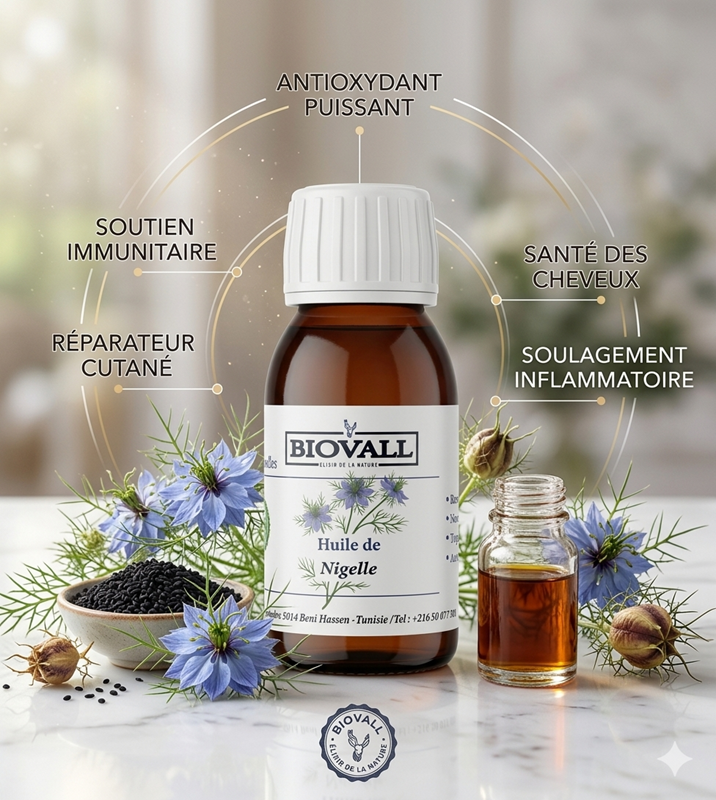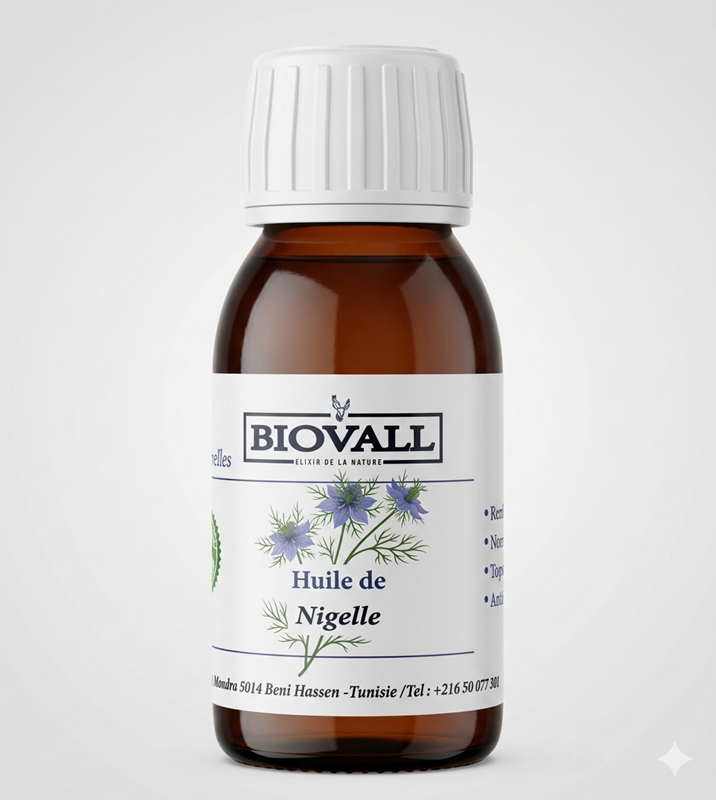 Huile de nigelle, un véritable trésor de la nature, est le produit phare de Biovall. Cette huile de nigelle pure est récoltée et mise en bouteille en Tunisie, offrant ainsi une solution naturelle pour le bienêtre et la beauté. L’huile de nigelle est reconnue pour ses propriétés antioxydantes puissantes, contribuant à la vitalité intérieure tout en rehaussant l’éclat naturel de la peau. En intégrant l’huile de nigelle dans votre routine de soins de la peau, vous optez pour un élixir efficace qui sublime votre beauté de manière bio et naturelle. Avec son riche ton ambré, l’huile de nigelle évoque à la fois pureté et puissance, faisant d’elle l’alliée incontournable des passionnés de santé et de bienêtre.
